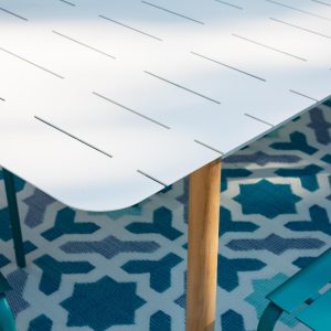 Zahvaljujoč stabilnemu in močnemu aluminijastemu podnožju je miza izjemno trdna, hkrati pa lahka za premikanje. Njena vremenska odpornost omogoča brezskrbno uporabo na prostem, ne glede na letni čas. Kaljeno steklo s keramičnim videzom doda pridih elegance in sofisticiranosti ter je enostavno za čiščenje.